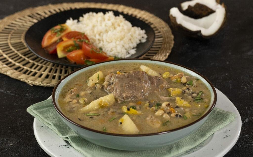 Picar el ñame, la yuca o ambos, cuando el frijol ablande, agregar la carne, el guiso y los demás vegetales a la olla. Cocinar por otra hora.