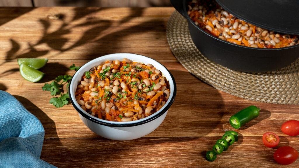 Pasado este tiempo, agregar la pasta de tomate, jalapeños y los frijoles previamente cocidos. Dejar reducir por unos 15 minutos más y servir con cilantro fresco picado.