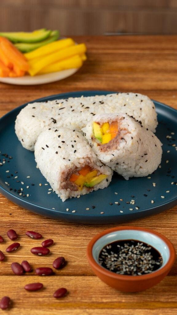 Para armar los rollitos, poner sobre la mesa un pedazo de papel de cocina vinipel o plástico, agregar un poco del arroz y hacer una capa delgada de aproximadamente 1 cm de grosor y en forma rectangular. Adicionar una capa de puré de fríjol en el centro y en capas los vegetales.